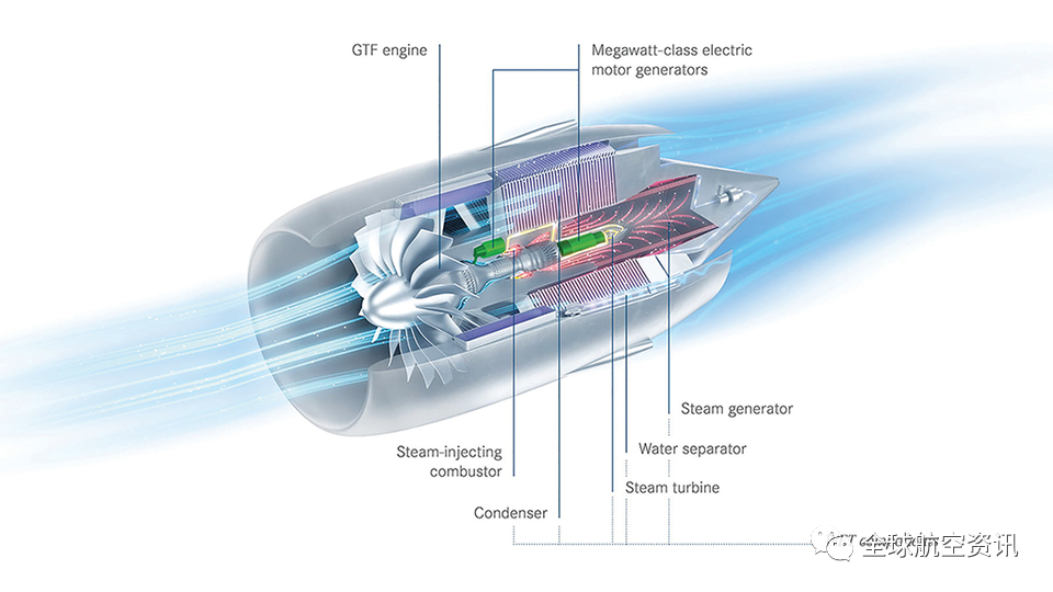 在亞音速領(lǐng)域,空客公司還與普惠公司和MTU航空發(fā)動機(jī)公司合作,參與歐洲“清潔航空”研究計劃下的另一個先進(jìn)推進(jìn)項目Switch。Switch的目標(biāo)是在21世紀(jì)30年代中期投入使用,目標(biāo)是減少25%的二氧化碳排放,減少80%的氮氧化物排放,并減少不明原因的尾跡排放。在WET概念下,從廢氣中收集水,并使用熱交換器將水蒸發(fā)成蒸汽。蒸汽被注入燃燒室,從而提高了燃料效率。
